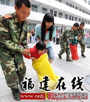 6月1日,福建连江公安边防战士与智障儿童一起做游戏。