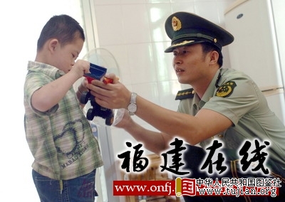 5月31日,福建省龙海市紫泥边防工作站的战士来到该市石码镇渔业社区,看望一名六岁的智障儿童,为他送去玩具,共度儿童节。新华社发
