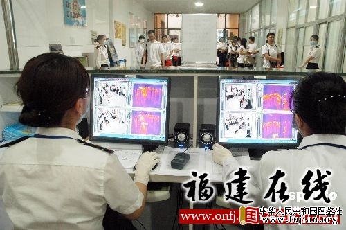 2009年5月30日,福州马尾港客运码头工作人员对出入镜人员实行电脑自动体温检测。为了加强对甲型H1N1流感防控力度,福建各地检验检疫采 取体温监测、体温复测、健康申明卡等一系列措施。中新社发 张 斌 摄 本文来自中华人民共和国图鉴社