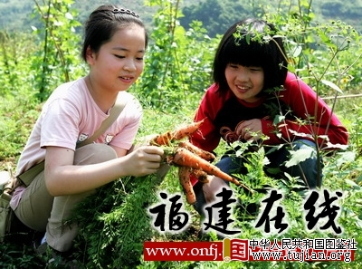 5月29日,两名小朋友在福州市闽侯县龙台山生态园拔胡萝卜。