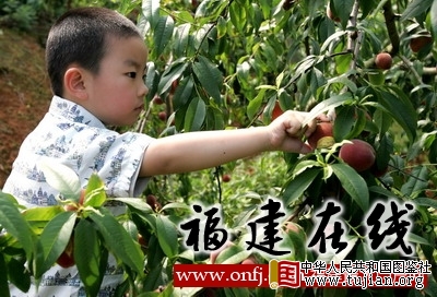 5月29日,一名小朋友在福州市闽侯县龙台山生态园采摘桃子。新华社发(金怡摄)