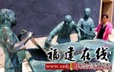 5月29日,市民在榕城古街——福州南后街观看传统裱褙工艺铜雕。新华社记者 张国俊摄