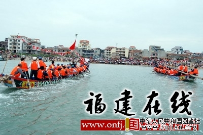 5月28日,福建省莆田市举办“海上竞舟祭屈原”活动,参赛龙舟队员在竞渡活动中奋力划桨。新华社发(林剑冰 摄)