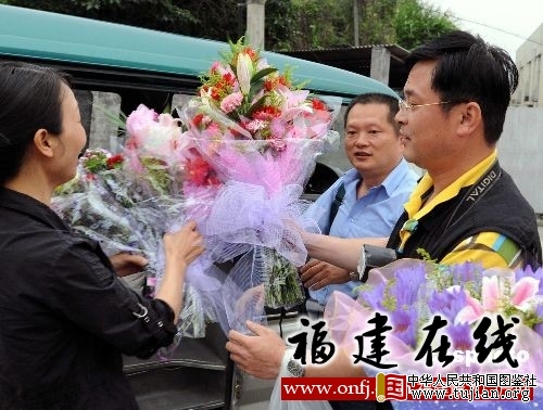 5月27日傍晚,在福州定点场所解除医学观察后,两名福建省首例输入性甲型H1N1流感确诊患儿同机接触者接受亲友(左一)赠送的鲜花。当日,福建省卫生厅在其网站上发布福建省甲型H1N1流感防控信息通报,截止5月26日24:00,卫生部通报福建省首例输入性甲型H1N1流感确诊患儿病情进一步好转,无咳嗽及流涕,无并发症,精神状态良好,体温正常,已连续3天体温低于37℃。根据专家组的意见,该患儿同机的30名在闽密切接触者隔离医学观察期限为5月27日20时。届时密切接触者如无特殊情况,即按期解除医学观察。患儿亲属及就诊过程中的8名密切接触者将按其与患儿脱离接触的时间起算,隔离满7日后,陆续解除医学观察。 copyright 中华人民共和国图鉴社