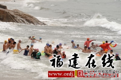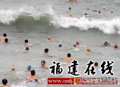 5月27日,闽台两地游泳爱好者在海上长泳活动中迎着风浪入水。新华社记者姜克红摄