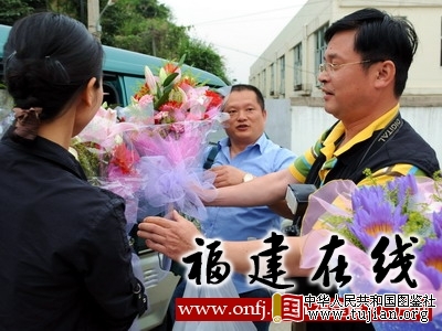 5月27日,解除医学观察的福建甲型H1N1流感密切接触者(右一、右二)接受亲友的祝贺。
