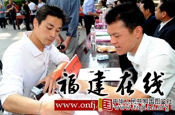 5月12日,福建省周宁县青年张林峰(左)注册成为地震救援志愿者。当日,为纪念汶川地震一周年和迎接5月12日我国首个“防灾减灾日”,福建省各地开展地震救援志愿者注册活动,拉开地震救援志愿者行动序幕。