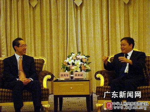 香港政务司司长唐英年“走遍珠三角规划纲要九城市”的行程,二十五日抵达第八站广东惠州,并在当天下午与惠州召开了交流合作座谈会,会商现代服务业的深度合作。图为唐英年(左)与惠州市委书记黄业斌(右)亲切交谈。作者:宋秀杰 康孝娟