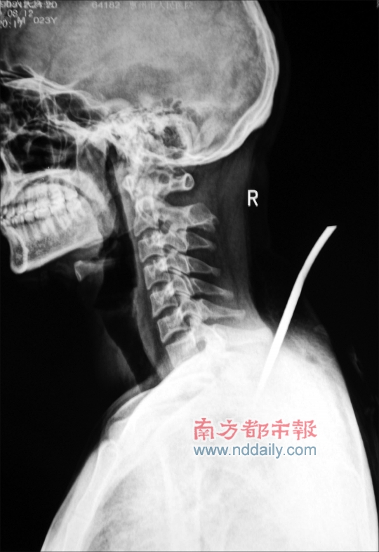 X光照清晰地显示,患者肩部被插入一把15厘米的刀。记者田飞 通讯员 黄宇强 摄