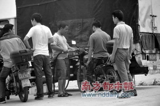 两摩托车停在货车旁加油[JiaYou]。 南都记者[JiZhe] 梁炜培 摄