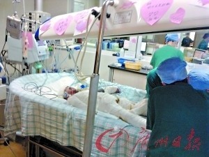 红会医院[YiYuan]烧伤[ShaoShang]ICU主任李孝建介绍了小蓉手术[ShouShu]的情况:首次植皮手术[ShouShu]以挽救生命为主要目的,切了头皮[TouPi]移植到双下肢的烧伤[ShaoShang]创面上,总共切了4%的好皮,修补了30%~40%的烧伤[ShaoShang]面积——不足的部分用了很多生物敷料补充。其实,小蓉的头顶都有一片烫伤,能用的好皮非常有限。所幸儿童的头皮[TouPi]生长能力比较强,等到下周新的头皮[TouPi]长出,又可进行第二次植皮手术[ShouShu],再修复躯干和四肢的深度烧伤[ShaoShang]创面。
