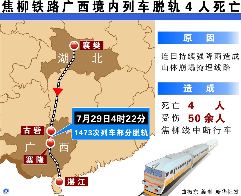 焦柳铁路列车颠覆事故已致4人死亡50多人受伤 新华网南宁7月29日电(记者向志强)来自南宁铁路局29日8时50分传来的最新消息,焦柳线广西融水境内旅客列车颠覆事故已造成4人死亡、50多人受伤。 事故发生后,广西壮族自治区主席马飚,自治区副主席杨道喜于29日7时紧急赶赴事故现场指挥抢救。(完) 焦柳铁路列车颠覆事故所有伤员和旅客都获及时妥善救治和安置 新华网南宁7月29日电(记者向志强)来自南宁铁路局29日9时的最新消息,当日早上8时前,焦柳线广西境内旅客列车颠覆事故所有伤员都已被送到医院救治,其他所有旅客都已被送到柳城火车站妥善安置。(完) 焦柳铁路广西境内因山体崩塌导致列车脱轨4人死亡 新华社北京7月29日电(记者齐中熙)29日4时22分,由襄樊开往湛江的1473次旅客列车运行至焦柳线广西境内古砦至寨隆间,因连日持续强降雨造成山体崩塌掩埋线路,列车机车及机后1-4位车辆脱轨,造成4名旅客死亡,50余名旅客受伤,焦柳线中断行车。 记者从铁道部获悉,事故发生后,铁路部门立即启动应急预案,全力救治受伤旅客,迅速组织救援,做好事故列车旅客的安置工作,抓紧恢复行车。(完) 焦柳铁路广西境内因山体崩塌导致列车脱轨 新华网南宁7月29日电(记者向志强)记者从南宁铁路局了解到,由于持续强降雨影响,7月29日4时30分,襄樊至湛江1473次旅客列车运行到焦柳线广西境内融水县1568公里加261米处时,因线路路堑发生坍塌落石,造成机车及1;2位车辆颠覆,3、4位车辆脱线。到记者发稿时,已有2名旅客死亡、10余人受伤。 事故发生后,南宁铁路局立即启动事故应急预案,5时02分开出救援列车,全力抢险和救治伤员。南宁铁路局局长等负责人已赶赴事故现场指挥救援,并迅速将事故情况通报有关地方政府。 27日晚到29日,广西桂北、桂中阴天有中到大雨,部分地区有暴雨,局部有大暴雨并伴有雷电、短时大风等强对流天气。由于强降雨影响,造成焦柳线1568公里加261米处发线路路堑发生坍塌落石。(完) 焦柳铁路广西境内因山体崩塌中断行车 新华社北京7月29日电(记者齐中熙)29日4时22分,由襄樊开往湛江的1473次旅客列车运行至焦柳线广西境内古砦至寨隆间,因连日持续强降雨造成山体崩塌掩埋线路,列车机车及机后1-4位车辆脱轨,造成4名旅客死亡,50余名旅客受伤,焦柳线中断行车。 记者从铁道部获悉,事故发生后,铁路部门立即启动应急预案,全力救治受伤旅客,迅速组织救援,做好事故列车旅客的安置工作,抓紧恢复行车。