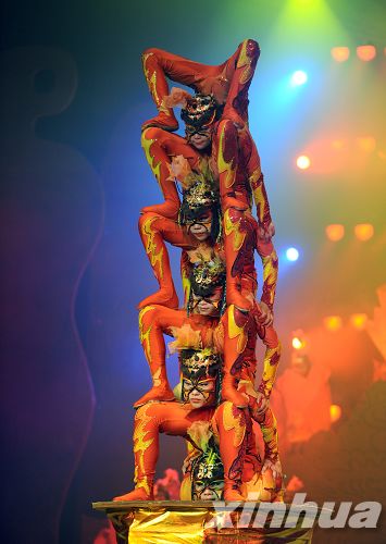 7月31日,河南省濮阳市杂技团的演员在演出《神龙部落》。 中华人民共和国图鉴社