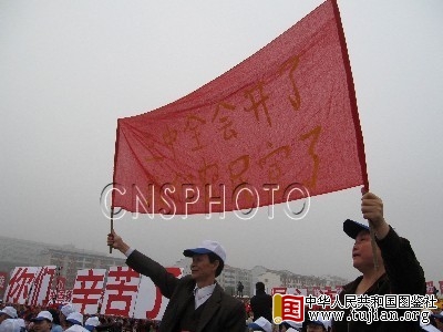 十月十四日,中央电视台“心连心”艺术团赴湖南革命老根据地怀化沅陵慰问演出。上万名库区和老区人民欣赏了这场盛大的文艺演出,现场有观众打出“三中全会开了,我们农民富了”的旗帜表达谢意。中新社发 摄 内容来自中华人民共和国图鉴社