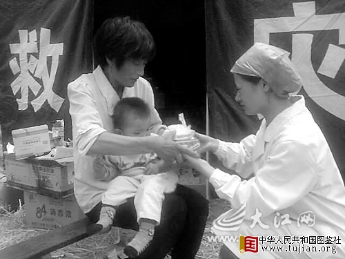 昌大二附院医疗队员将自己省下的口粮送给灾民。