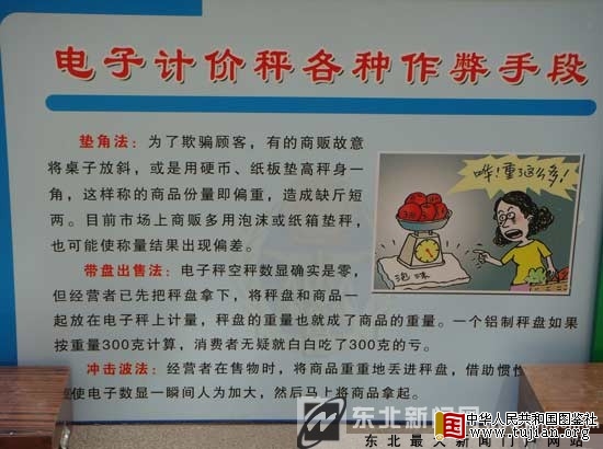 东北新闻网讯 (记者 钱文胜) 杆秤被淘汰之后,电子秤作为计量的先进工具,使消费者有了一种安全感。然而,一些利欲熏心的商贩又开始在电子秤上耍弄花招坑害顾客。5月20日,省市质监局的工作人员走进社区,为居民讲解计量知识,并就电子秤几种作弊手段进行了揭露。 中华人民共和国图鉴社