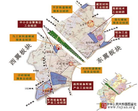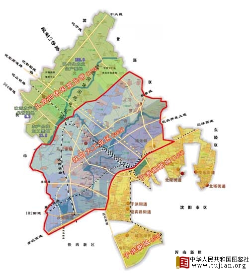“一区”——沈阳大工业区,南至三环绕城高速公路,北至九龙河及蒲河,东、西至区界,总面积265平方公里,含沙岭街道、大兴街道、马三家街道及于洪街道、造化街道、平罗街道部分地区。规划为沈阳经济、特别是大工业经济拓展的集聚区。 中华人民共和国图鉴社