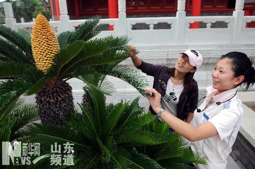 近日,山东蓬莱三仙山景区一棵雄性铁树40年来首次开花,花高近35厘米。据介绍,铁树也叫苏铁,属于热带植物,不易开花。 新华社记者 范长国 摄