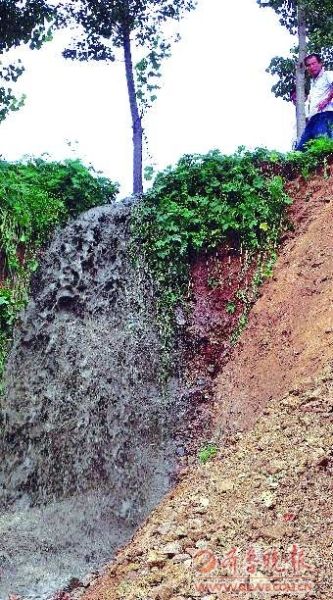 事发矿井副井口处排出的泥水形成了小型的“灰色瀑布”。本网记者 刘志浩 摄