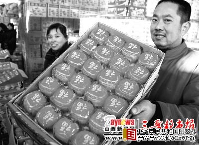昨日,在太原市水西关果品批发市场,一位摊主正在展示“福”字芦柑,随着苹果、香蕉、梨等水果价格的上涨,价格较低的芦柑受到了市民的青睐,现在芦柑的市场批发价为每公斤2.4元左右。