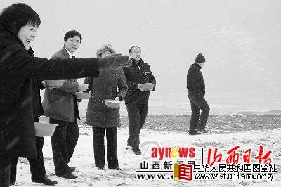 1月18日,连日的大雪使得平陆县张村镇三湾村黄河湿地遭遇冰封,近百名干部群众顶风冒雪向冰封的河床抛洒食物,以保证在此越冬的白天鹅不受饥饿之苦。 copyright 中华人民共和国图鉴社