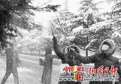 1月19日,晋南大地普降瑞雪,为防止大雪压断树枝,侯马市园林局的干部职工拿着竹竿走上街头,对树木进行护理。