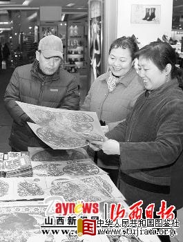 民间剪纸艺术家向顾客介绍剪纸作品(图)