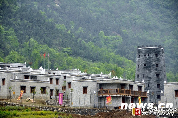 5月9日,“吉娜”新羌寨全貌。在去年5.12特大地震中遭受严重破坏的北川擂鼓镇猫儿石村“吉娜”羌寨,在山东省济南市对口援建下,从废墟上拔地而起,69户原“吉娜”羌寨居民今年春节前重新搬回新寨,迁入新居。新华网 前卫 摄