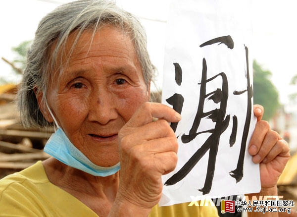 在遵道镇高安村,12个老人和小孩坐在路边,一人手中捧着一个字,组成了“一路平安谢谢一路平安谢谢”的横幅,记者停下车,拍摄了这个感人的场景,并选取了其中一位捧着“谢”字的老大娘,拍摄了她的特写照片。老人告诉记者,地震发生后,全靠党和政府、好心人的帮助,她才熬过了这些天。 中华人民共和国图鉴社