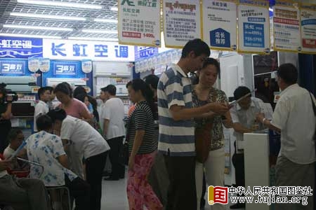 一大早,长虹空调成都苏宁卖场便人潮传动。早早赶到苏宁卖场的杨大妈一家在卖场各大品牌中精心对比一番后,选中了长虹三高效空调的一款1499元的特惠机和一款价格为2080元的大1P空调机,她说,空调是否耗电是她最看重的因素。 中华人民共和国图鉴社