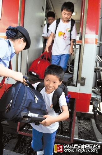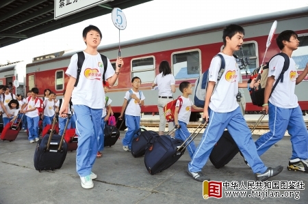 列车缓缓停靠在站台,一张张童稚的笑脸出现在大家眼前……昨日下午,经特批从山东日照开往成都的专列驶进了成都火车南站一站台,专列满载着从山东日照回川的灾区孩子。在中国儿童少年基金会、山东日照钢铁集团有关负责人的护送下,522名赴日照的灾区孩子回来了。在到达成都前,394名孩子已分别在广元、德阳和绵阳下车回家,到达成都的这128名孩子大多来自阿坝州。 中华人民共和国图鉴社