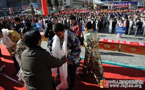 3月2日,在康定县城情歌广场,当地领导向藏族农牧民子女代表献哈达鼓励他们好好学习。新华社记者江宏景摄