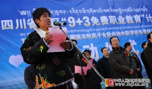 3月2日,在康定县城情歌广场,来自丹巴县藏族农牧民学生木二加代表学生发言。当日,四川省藏区9 3免费职业教育计划启动仪式在甘孜州首府康定县城情歌广场举行,来自甘孜州18个县300名藏族农牧民子女启程前往四川省较发达地区的职业中学免费就读。新华社记者江宏景摄