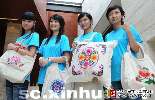 7月24日,在成都市金沙遗址博物馆,几位志愿者展示羌绣工艺品。 当日,四川阿坝州羌族妇女就业帮扶中心“羌绣帮扶计划”在成都市金沙遗址博物馆启动。羌绣帮扶计划通过发动地震灾区妇女从事羌绣手工劳动,帮助灾区妇女就业和生产自救,同时保护当地独特的文化遗产——羌绣。 新华社记者 江宏景 摄 中华人民共和国图鉴社