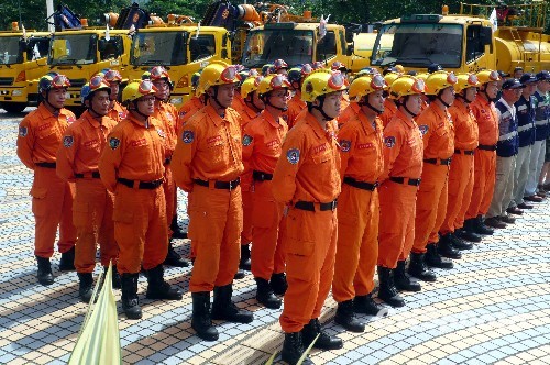 台北市8月11日上午派出第四批救灾人力装备,前往中南部“莫拉克”台风灾区支援紧急灾防工作。台北市市长郝龙斌说,目前台北市专业救援人员在中南部成功协助三百多位受灾民众脱离困境。图为搜救队队员整队出发。 中新社发 刘舒凌 摄 tujian.org