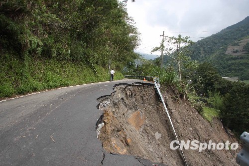 8月12日,中新社跋山涉水、深入南投信义乡采访,这里灾情惨重,道路、隧道、农业遭受“莫拉克”台风重创,却无一人死伤,不能不说是奇迹。图为一条公路局部被毁,行人路过须格外小心。 中新社发 董会峰 摄 中华人民共和国图鉴社