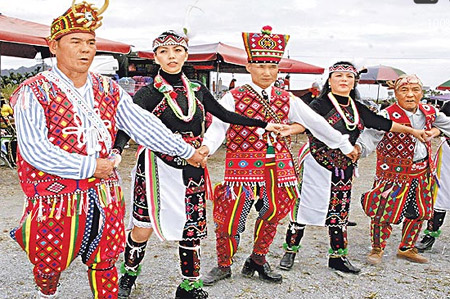 阿妹(左二)与族人感情甚笃,每年都回台东参加丰年祭