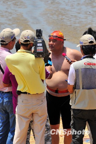 8月15日,现年45岁、本已退居二线的的游泳名将张健复出,参加“2009金厦海域泳渡活动”。虽然成绩一般,张健在抵达小金门海滩时还是欣然接受记者采访。 中新社发 董会峰 摄 本文来自中华人民共和国图鉴社