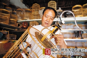 张来顺说,别看这小小的鸟笼,制作起来可不是一件简单事。首先是选材,要选用自然生长3到5年的毛竹,不够年头的竹子发软,太老的竹子又容易崩开。而且选竹子时就要注意皮色的完整,这砍完的青竹子在运输的时候还要轻手轻脚,不能磕碰,否则就像皮肤一样,要落下疤痕。把竹料破成小料以后,还要盘好了放在锅里面蒸,出锅后趁着热乎劲把竹料盘成小圈,这就是鸟笼的上下“圈”。鸟笼的一棵棵“条”是用专门的模具拔出来的,一棵“条”至少要拔5遍才能过关。你要是偷懒少个一两遍,老玩家一上手就能摸出来,因为光滑度的手感不一样。这一个鸟笼子,从下第一批料开始,到最后成型,周期快的也得用20多天。因为有多年钳工的功底,再加上爱琢磨,张来顺做出来的鸟笼子不但造型讲究,还格外结实,现在,他的一对精品鸟笼子价值不菲,但是也经常脱销。因为有时候东北的客人一来,点名要“大张”的笼子,做工最细的精品鸟笼照单全收。不但在东北,在整个北方,喜欢养鸟的人都认为“天津笼子”是做工最讲究的,而“大张”就是这“天津笼子”里的一个代表。 中华人民共和国图鉴社