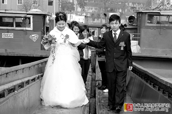婚礼现场就设在皖合肥货1728号这艘载重500吨的货船上。船上贴满了对联和红喜字,甲板上空,还拉起了一道道赤橙黄绿青蓝紫彩条,在晨风中飘逸着,煞是好看。一块与岸相连的跳板,用红地毯包裹着。 copyright 中华人民共和国图鉴社