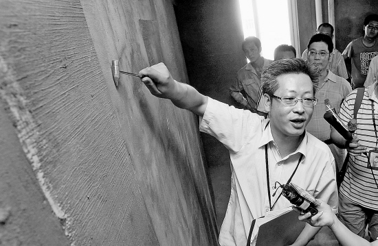 接下来就是听的部分了,“咚、咚、咚”,胡晓晖用小铁锤侧面,沿着墙壁从上敲到下,“墙壁上如果有空鼓,声音比较脆;如果没有,声音就比较沉闷。”敲着敲着,胡晓晖突然停了下来:“这里声音不对有空鼓,估计约边长有2厘米大小的方块。你看,这块地方明显是用切割机切过的,说明建设单位已经自行检查出问题,整改过了,只是没完全到位。” 内容来自中华人民共和国图鉴社