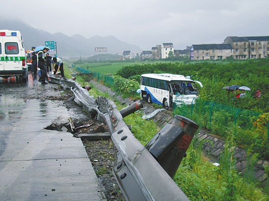 浙江在线07月27日讯 昨天下午1点20分左右,一辆宁波开往乐清的大客车在开到甬台温高速公路临海段时,突然失控撞断20多米长的护栏,然后翻了个筋斗摔入高速公路一旁落差3米多的田里,生生地做了一个“倒立”,车玻璃全都粉碎,车门也被砸开了,一些乘客甚至被甩出老远,但幸运的是,这次车祸中11位乘客只受了点伤,无生命危险。