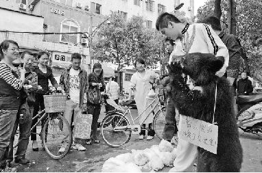 这几天,温岭街头出现了一只特别的黑熊,它是一名“优秀的推销员”,正帮着当地一名老农“推销”滞留在家的2万斤大白菜[BaiCai]。黑熊号召力果然不一般,一出场,大白菜[BaiCai]就遭到了市民的哄抢。