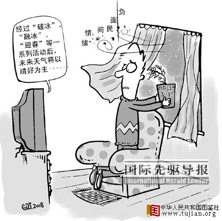 但是,仍然棘手的问题在于,中日政治关系走向友好的时候,两国民间感情怎么融合?不可否认,中日两国民间信任基础依然很脆弱,对峙情绪仍未完全消除,这种状况显然与中日政治关系的发展进程不太合拍。 中华人民共和国图鉴社