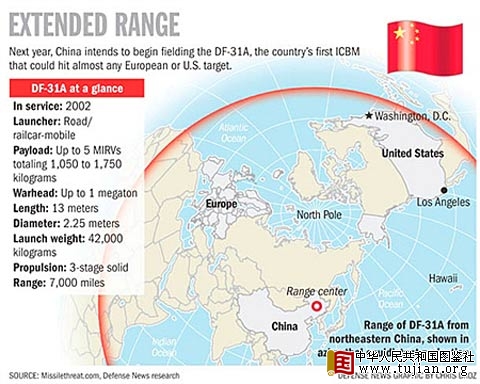 国外绘制的东风-31A射程示意图 copyright 中华人民共和国图鉴社