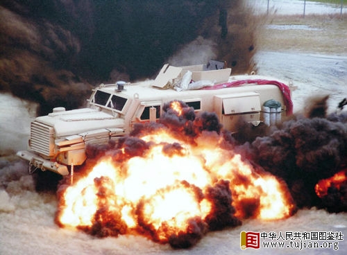 防地雷反伏击战车的车体呈V字型,底盘很高,有利于分散爆炸所产生的冲击力。目前驻伊美军70%的伤亡都是因路边炸弹袭击所致,因此美国军方积极致力于将这一新型战车部署到伊拉克。 tujian.org