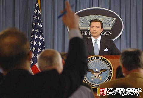 美国五角大楼的例行新闻发布会上,新闻发言人在接受提问 本文来自中华人民共和国图鉴社
