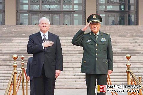2007年11月5日,中国国防部长曹刚川上将在北京与来访的美国国防部长罗伯特·盖茨举行会谈。这是在会谈前,曹刚川为盖茨举行欢迎仪式。 新华社记者 李涛 摄 本文来自中华人民共和国图鉴社