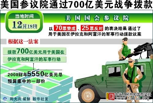 资料:2007年12月19日 图表:美国参议院通过700亿美元战争拨款 新华社发 内容来自中华人民共和国图鉴社