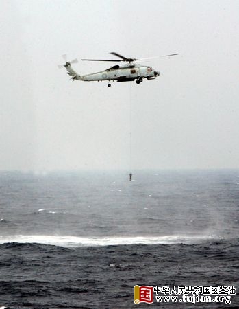 S-70C型反潜直升机投下声呐定位对手潜艇。